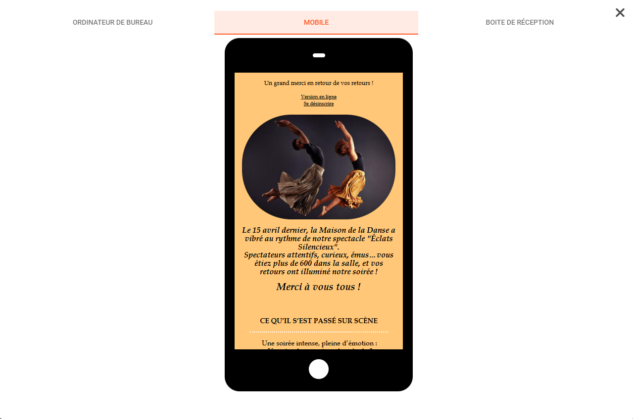 👁️ Prévisualisez votre email dans plus de 100 boites de réception (gmail, free, orange…) avant envoi.